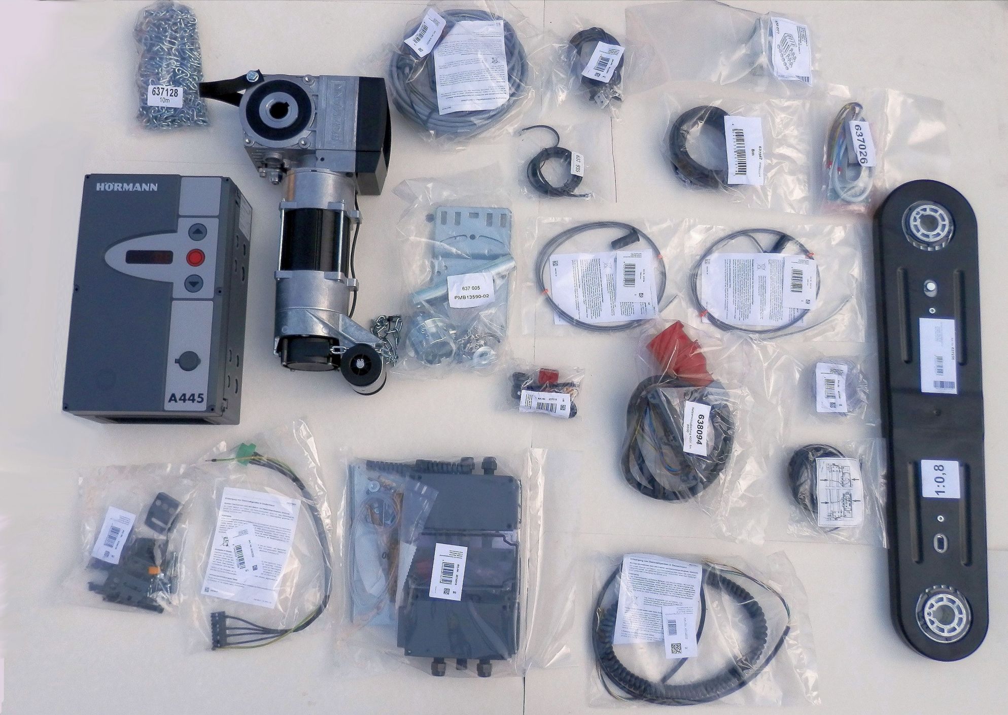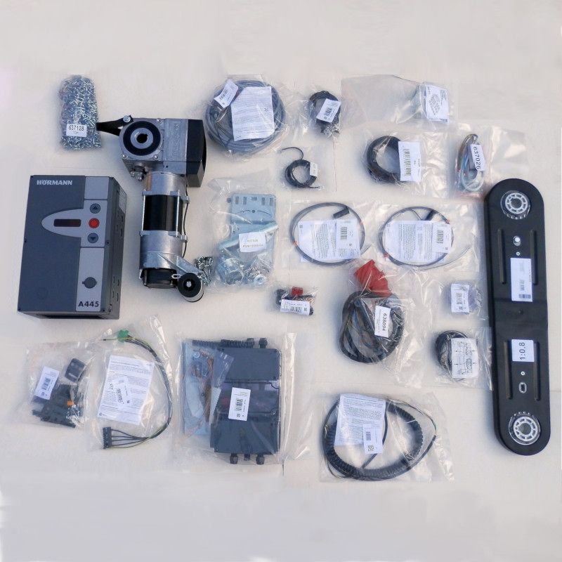 Kompletny zestaw automatyki do bramy segmentowej przemysłowej Hormann WA400 z przekładnią łańcuchową o przełożeniu 1:0,8.