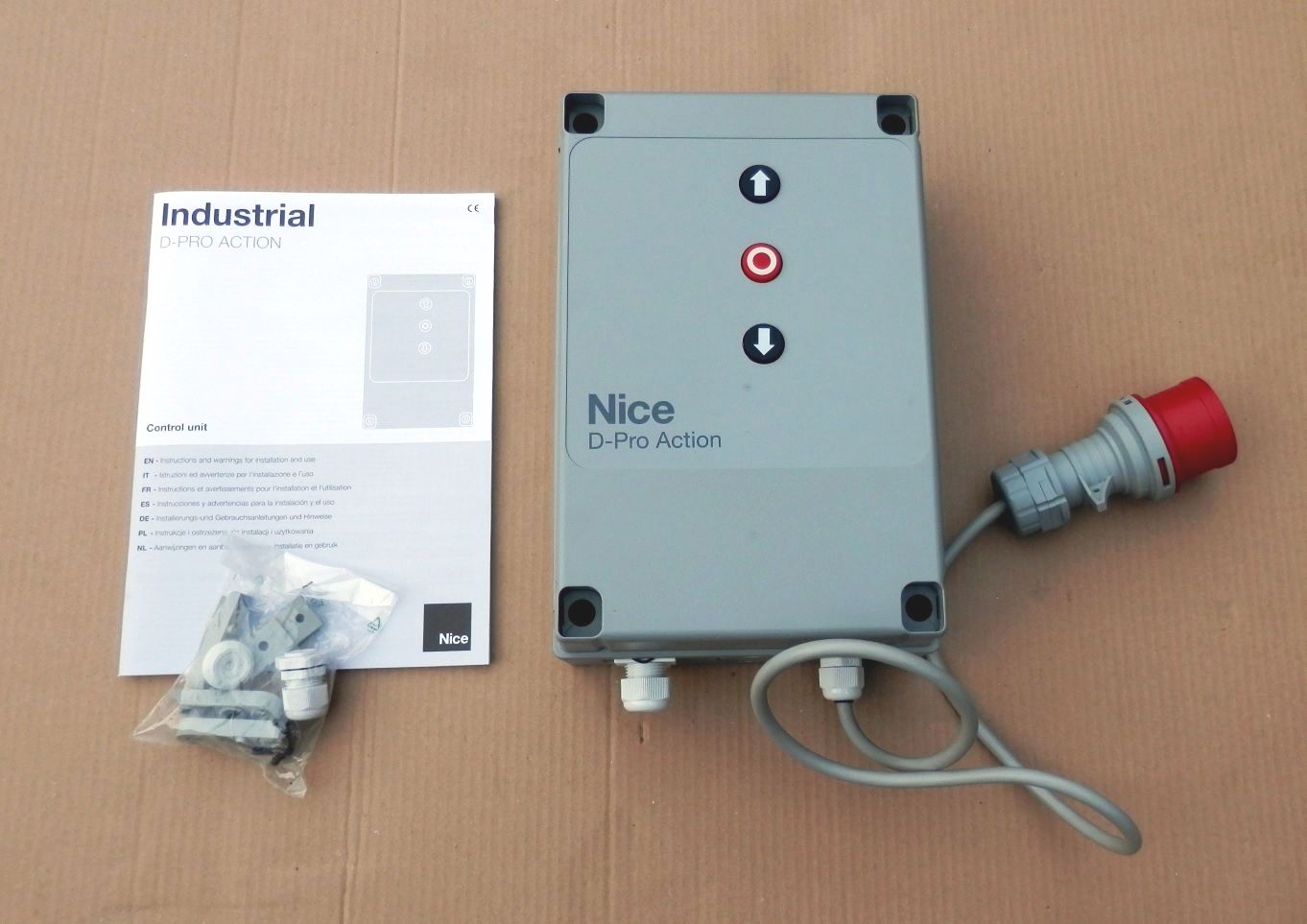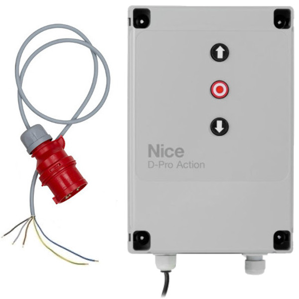 Centrala NICE D-Pro ACTION (NDCC2000). Centrala obsługuje napędy do 2,2 kW z mechanicznymi lub elektronicznymi krańcówkami, do pracy w trybie półautomatycznym (sterowanie impulsowe) lub manualnym (Totman). Zasilanie 3x400V.