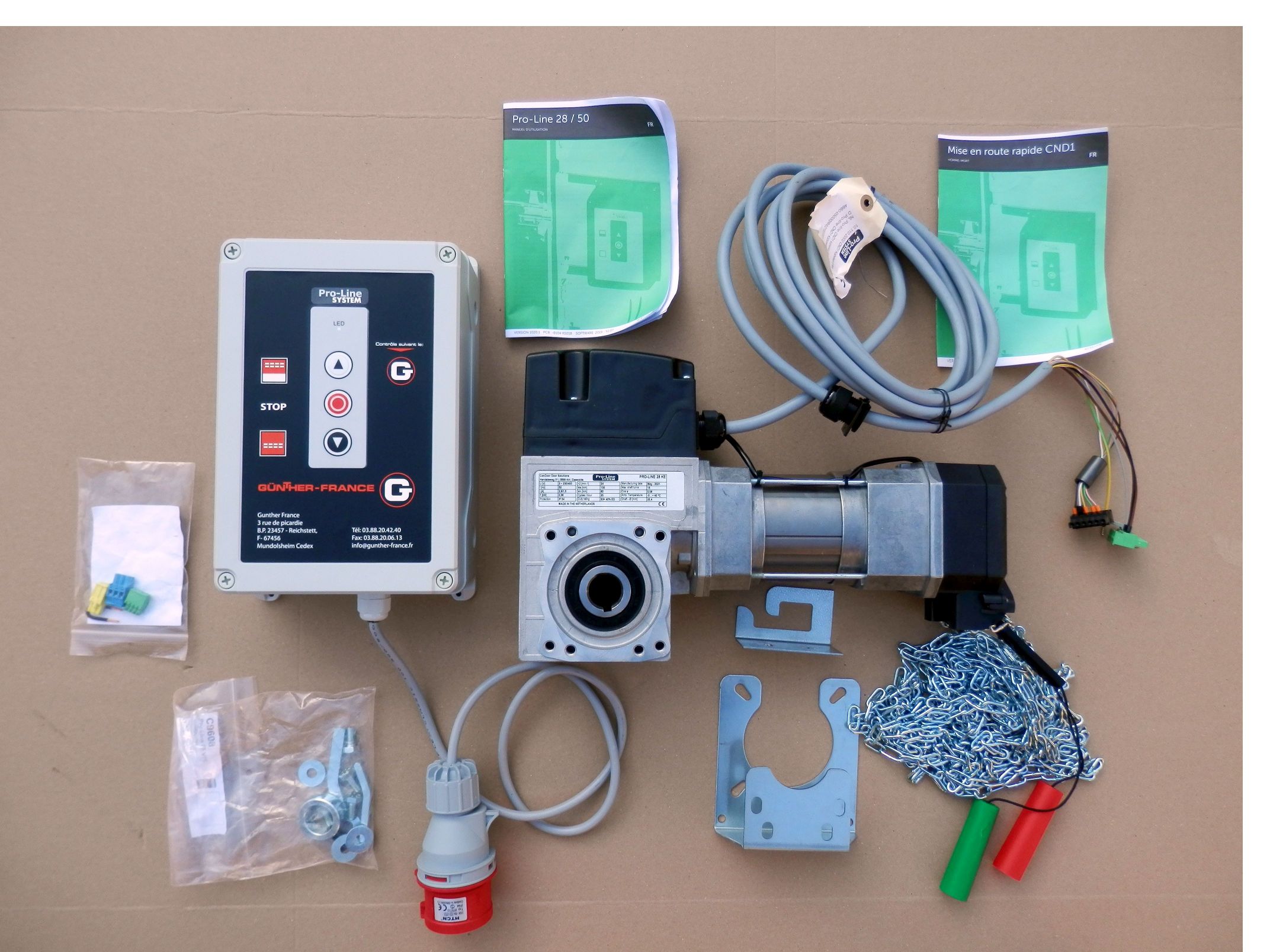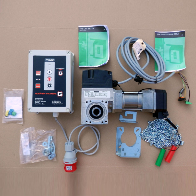Zestaw automatyki do bram segmentowych, holenderskiej firmy PRO LINE SYSTEM. Zalecany do bram o maksymalnej powierzchni 25m2. W zestawie znajduje się: napęd do bramy, centrala V7E służąca do sterowania napędem, mechanizm awaryjnej obsługi ręcznej  pozwalający za pomocą łańcucha otworzyć/zamknąć bramę w przypadku braku prądu, przewody połączeniowe, elementy montażowe.  Napęd przystosowany jest do wału o średnicy 25,4mm (1″). Zestaw zasilany jest napięciem 3N~400V.